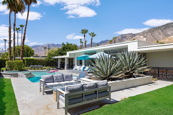 With 2,786 spacious sq ft, this home features a picture-perfect backyard with heated pool, bubbly spa, and ample lounge chairs. Like the inside, the outside is stylishly furnished for comfortable, modern living and dining.