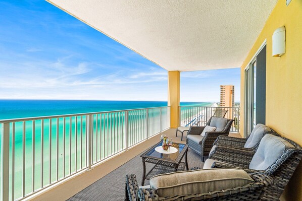 Your stay will be unforgettable as you'll see breathtaking views of the gulf and miles of coastline from our 15th floor unit. Our huge 10 X 28 ft. balcony is an ideal vantage point to routinely spot schools of fish, sting rays, and dolphins. It's also the perfect place to lounge and relax to peaceful sounds of ocean waves and gorgeous sunsets. Our balcony is accessible from both the living area and the ocean-facing master bedroom (many properties on the beach have the master bedroom facing the street).