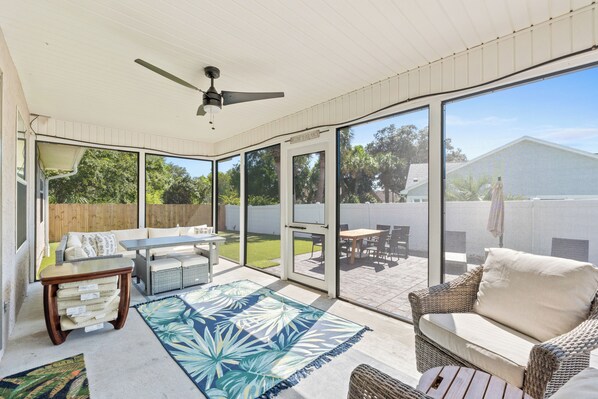 Escape to the outside oasis with a screened in porch with seating or lounge by the pool on one of the chaise lounges or at the dining table. Create fun summer memories in the private pool or work on your short game with the 3-hole putting green.