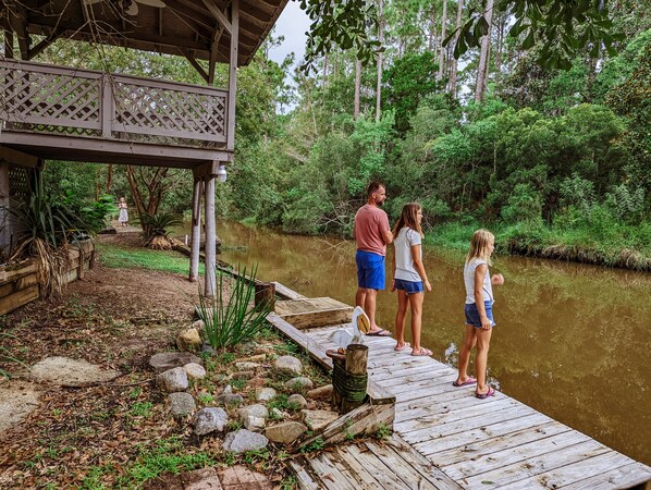 *The canal experiences changes in water depth depending on the time of year and rainfall, therefore we cannot guarantee that you will be able to fish or kayak during your stay. It tends to be much shallower during the winter months, but has also flooded into the backyard during heavy rainfall. Swimming is not advisable.