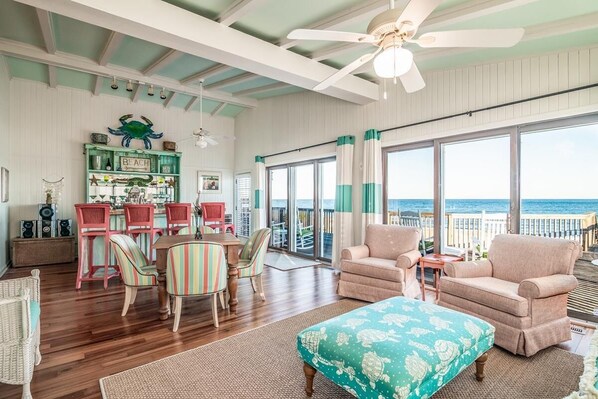Unwind in this unique oceanfront retreat, where Litchfield Beach is right at your doorstep. With six gracious bedrooms and four and a half baths, this classic colorful beach-style home offers pure charm and comfort. Guests will enjoy numerous seating areas in the open floor plan, a master bedroom study, a fun cozy kitchen with upgraded appliances, an entertainment bar plus loads of storage.