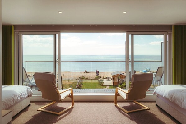 The top floor boasts an amazing master bedroom suite. This has a super kingsize bed plus two single beds, making it ideal for families. This room also has an en-suite bathroom with a bath and shower over. The views over the beach and sea are absolutely spectacular and the suite boasts a private balcony where you can really soak up the sea air.