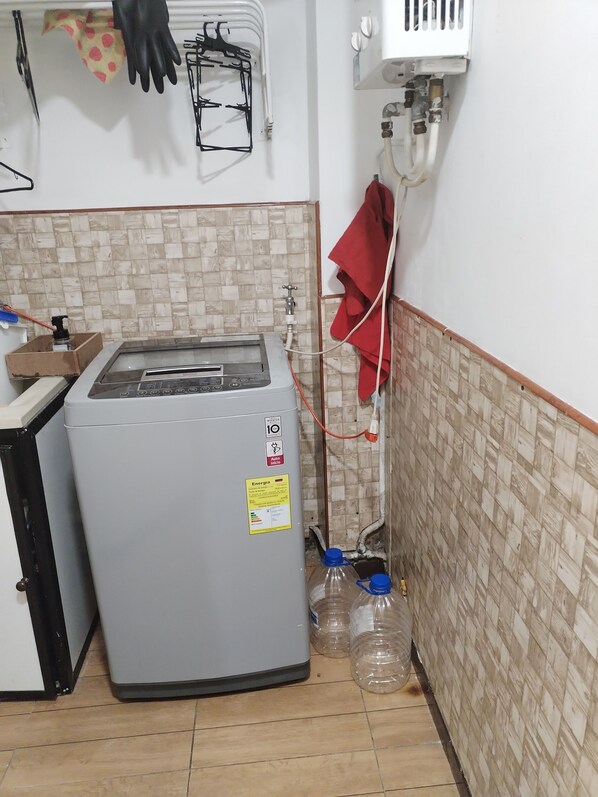 This smoke-free apartment building features laundry facilities. The apartment features a washing machine, a sofa bed, and an iron/ironing board.