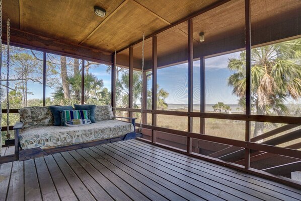Chances are, you’ll find you spend most of your time at Sweet Nancy’s on the spacious back deck. The large green den porch is decked out with comfy furniture including a sleeper swing, so you’ll linger here often. It’s an ideal spot to slip off your flip flops, feel the gentle offshore breezes, listen to the eclectic coastal birdsong, savor a glass of wine, enjoy a good book, or simply relax on the swinging day bed and catch a catnap.