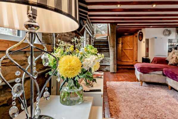 Enter through the boot room, where you can leave coats and shoes, then continue into the bright and airy open-plan lounge/kitchen/diner. A wood burner is set to one side, adding charm to the space, while comfortable seating and a Smart TV invite restful nights filled with relaxation. The fully equipped kitchen and generous dining area provide the perfect setting for mealtimes. From here, wander into the ground-floor bathroom, which features a unique sunken bath. Grab your bubbles and enjoy a luxurious soak. Up the cottage-style stairs, the first-floor landing, nestled beneath the property’s eaves, offers a quiet spot to relax. Both bedrooms are accessible from this landing, each with low beams, angled ceilings, and breath-taking views across the hills. The master bedroom features a king-size bed with plenty of storage, while the second bedroom offers a versatile super-king-size zip-and-link bed.