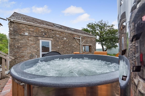 The open-plan lounge/diner exudes warmth and charm, with a crackling wood burner to create a cosy haven after a day of exploring. The country-style kitchen nods to the building’s heritage, providing all you need to prepare hearty meals using local produce. A contemporary downstairs wet room is ideal for rinsing off after tackling the nearby trails. Upstairs, the king-size bedroom features a Juliet balcony offering sea views, plus a Smart TV for relaxing evenings. The remaining bedrooms include a flexible twin and a family room with a flexible super-king-size bed, an additional single bed for children and a Smart TV. At the end of the day, indulge in a soak in the elegant free-standing bath in the family bathroom. Outside, the private patio is a lovely spot to enjoy morning coffee as the sun rises or toast the sunset with your favourite drink. Unwind in the bubbling hot tub while soaking up the rural surroundings. Additional conveniences include private parking for three cars and secure bike storage.