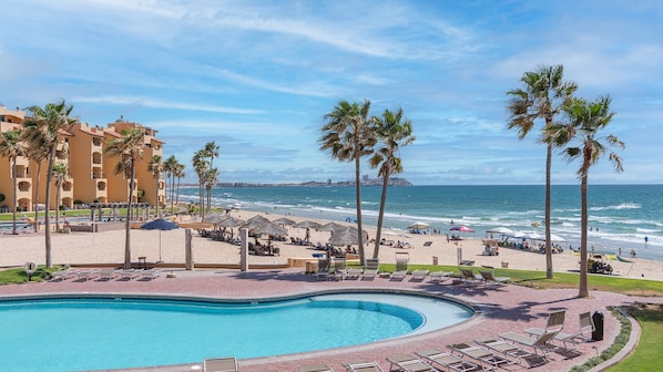 The Princessa de Penasco is a beach front resort with many wonderful amenities. The resort was designed to emulate the shape of an arc. The arc is made up of five yellow towers that have a beautiful Old World Mexican courtyard in the center. The courtyard has several red brick walkways with flower lined grassy areas shaded by palm trees. The resort has premium amenities like 3 swimming pools, a Jacuzzi spa, and palm frond umbrellas above lounge chairs in the sand. The resort also includes a sand volleyball court where you can challenge your neighbors to a game and an ocean view fitness center that has everything you need to stay in shape