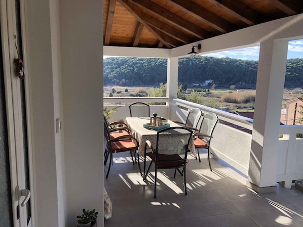 Kampor. The holiday apartment is located on an open plot with a lawn, flowers, shrubs and trees. The landlord lives permanently in the house, but uses a separate entrance. Access is via a side road (paved, length 50 m). Parking (for 5 cars) in the garage and on the property. Garage available on request for a fee.