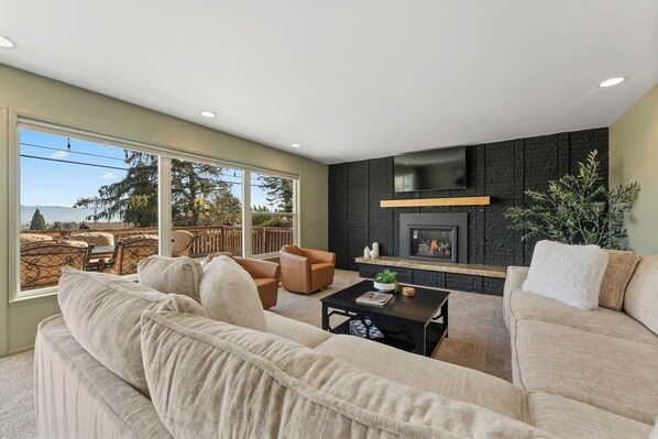 Our oversized living room is a natural gathering place with plush seating, a pool table, a gas-burning fireplace, and a large TV—perfect for game nights, movie nights, or simply relaxing after a day at Lake Tahoe or exploring Reno. Whether your group is big or small, this space adapts to the mood of the moment.