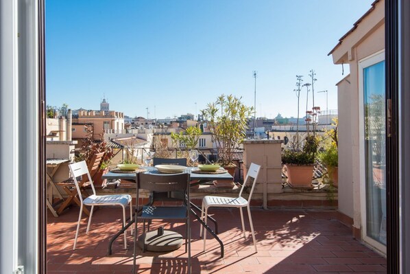 Perched above the Spanish Steps, this elegant penthouse offers a tranquil retreat. Unwind in the living area or step onto the panoramic terrace and soak up Rome's vibrant atmosphere with two double bedrooms and a fully equipped kitchen at your fingertips.