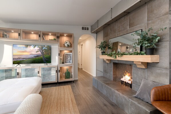 In the living room, unwind on the sectional sofa complete with a large smart TV.