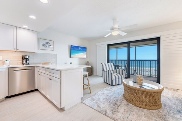 Direct gulf-front views from the large lanai. Fourth-floor location overlooks the pool and all the sights and sounds of our hypnotically-relaxing beach!
