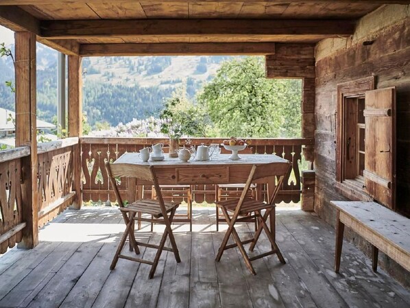Outdoor space: Two covered verandas on the ground floor and first floor, space to sit in front of the house next to the old barn, opposite the well. Mown meadow with tall trees below the house.