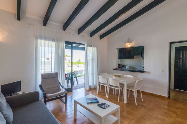 In Binisafùa, a village on the south coast of Menorca, the holiday home Casa N°3 (Letra O) can accommodate 6 people. It is situated on the north side of the Complejo Binisafua residential complex with 10 units, which have private patios as well as a common outdoor area. The holiday home Casa N°3 (Letra O) offers its guests a cosy living/dining room with high ceilings and dark wooden roof beams, a very well-equipped kitchen with a breakfast bar, 3 bedrooms with 2 single beds each that can be pushed together to a double bed, as well as one bathroom with shower. Amenities also include Wi-Fi and TV. There is a baby cot available free of charge and a high chair available for a fee. A second baby cot is available, if requested, for a fee. Outside there is a private, furnished terrace with a barbecue, which you can access directly from your living room. Here you can prepare fresh meals and round off mild summer evenings with a glass of wine. The shared outdoor area features a large lawn for sunbathing and a pool for refreshments on hot summer days. There is also a children's pool available for young guests. The beautiful, sandy beach Playa Binisafúller, with its turquoise blue water, is only 100 m away from the accommodation and 2 restaurants can be reached after 200 m or a 3-minute walk. A wide selection of shops, restaurants, bars and cafés, located in Binisafuller, are 2 km or a 5-minute drive away.