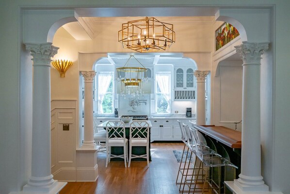 Second Level: Kitchen. Dining table seats 8. Island seating for 5. Bar seating for 3. Wet Bar. Powder Room. Living Room. Reading Nook. Covered Porch with Day Bed.