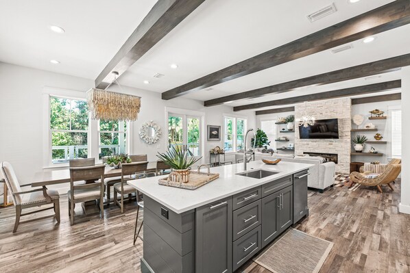 A small front porch welcomes guests to A Little Salty. Stepping inside, guests will find a bedroom with a king bed, and private bathroom with shower to the left, and a stairway to the right. A hall leads to a spacious and inviting living area with an open kitchen and dining space. Layers of rich textures, like tables carved from tree roots, nubby cotton throws, horn chandeliers, decorative clay pots, and woven baskets, create visual interest throughout A Little Salty. Dark wood floors and exposed ceiling beams balance a bright, airy kitchen with marble countertops, premium appliances, a wine chiller, and a side-by-side double oven. A dramatic beaded chandelier offsets a dining table with seating for 8. In the living area, 2 cozy sofas and artful bent-wood chairs surround a gas brick fireplace with a flat-screen TV. Glass doors open onto a porch with a porch bed swing, chairs, and an outdoor dining table. Steps lead down to a large pool and pool deck area with a fire pit, gas grill, and lounge chairs. Guests with young children will appreciate the pool’s ample sun shelf.