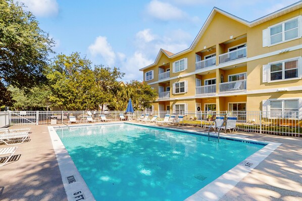 Pool-view condo with private balcony, AC, & Washer/Dryer