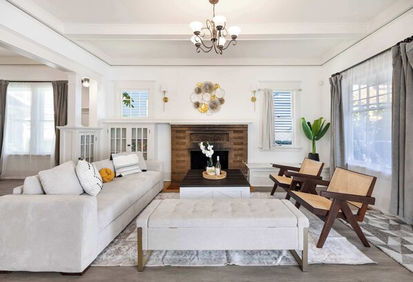 Our cozy and sun-lighted living room is an ideal setting for a family gathering. Sit back and decide if you will watch a movie or have a relaxing time reading near the fireplace. Not to mention YouTube TV with 80+ live channels, Netflix, and Disney+, they are all free to you.