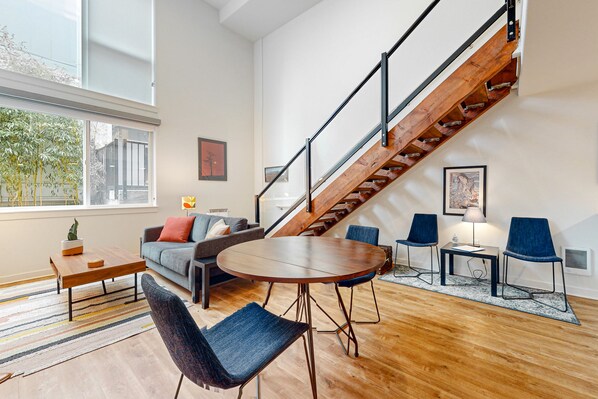 Situated in a secure building, this modern loft-style condo boasts hardwood floors, plenty of natural light, and a portable air-conditioning unit. Take in 360-degree views of the city skyline and Mt. Rainier from the comfort of the building's rooftop deck. Large windows invite natural light into the living room, while motorized blinds offer shade. Settle into the queen sleeper sofa and stream a movie on the smart TV. Listen to vacation playlists on the Bluetooth speaker. Work your culinary magic in the well-equipped kitchen outfitted with stainless steel appliances. Sip morning coffee at the kitchen bar and enjoy meals around the dining table. Or sizzle recipes on the communal grills while you take in the sights. Complimentary WiFi and a private washer/dryer are provided.