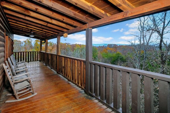 Air hockey, a felted pool table, and stadium seating in front of a large flat-screen await you here. Have family competitions and crown a winner! This space also has a pub-table and mini-fridge. This space opens onto wrap-around decking. Throw open the doors and breathe in the mountain air!