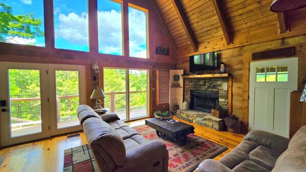 As you arrive at the cabin, the first thing you will notice is its' expansive view of Cove Mountain. It still takes my breath away every time I walk out onto the deck! When you enter the cabin, you will be immediately greeted by the cathedral ceiling and 11 front windows that tower 2 stories in the Great Room. The windows provide an impressive and constant view of Cove Mountain and Wears Valley.
