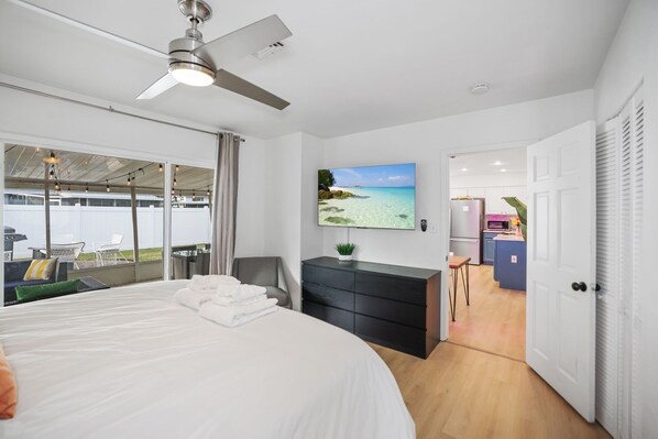 BEDROOM 3: king size bed, room darkening shades, dual night stands with lamps and smart plug-ins, 60 inch smart tv, dresser, closet