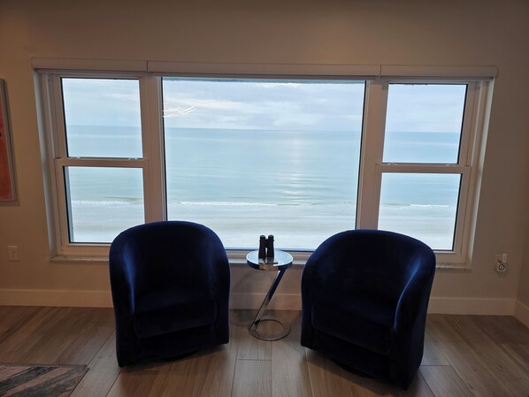 This condo has been transformed into a modern coastal sanctuary featuring sophisticated design elements throughout. The open-concept living space flows effortlessly from the gourmet kitchen to the dining area and living room, all anchored by stunning contemporary art and a cohesive color palette of ocean blues, crisp whites, and warm wood tones.