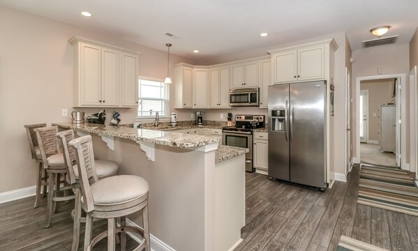 Welcome to ’Coastal Haven’! This 5 bedroom, 5.5 bathroom professionally decorated home is a short block away from the beautiful Surfside Beach and the Atlantic Ocean. A large open kitchen/dining/living area layout allows for easy entertaining and gatherings. Well-equipped kitchen with all large and small appliances, dinnerware, cookware, glassware & utensils to prepare and serve meals. The living area comes with all the comforts of home with plush furnishings and a TV for your enjoyment; continue throughout the home and you will find inviting and open bedrooms with a TV in each as well. Exterior amenities include covered porches to relax on, a private pool, and ample parking for five vehicles.