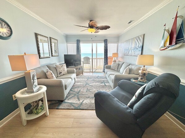 Ocean views await at this 2nd Floor Ocean Front Unit. Enjoy the private balcony, shared pool, and modern comforts like internet and televisions in every room. The fully equipped kitchen features a range & oven, microwave, refrigerator, dishwasher and basic kitchen amenities.