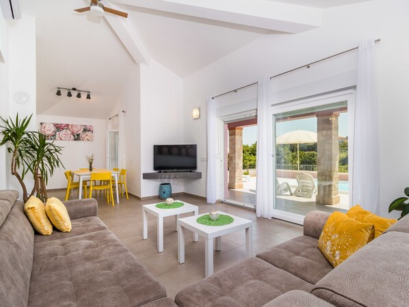 4-room house 130 m2. Beautiful and cosy furnishings: living/dining room with 1 double sofabed (140 cm, length 200 cm), satellite TV and air conditioning. Exit to the terrace, to the swimming pool. 1 room with 1 french bed (180 cm, length 200 cm), shower/WC and air conditioning. Exit to the terrace. 1 room with 1 french bed (160 cm, length 200 cm), shower/WC and air conditioning. 1 room with 1 french bed (160 cm, length 200 cm). Exit to the terrace. Open kitchen (oven, dishwasher, 4 induction hot plates, toaster, kettle, microwave, freezer, electric coffee machine). Shower/WC. Forced-air heating. Terrace 26 m2 partly roofed, terrace 8 m2. Terrace furniture, deck chairs. View of the swimming pool. Facilities: washing machine, hair dryer. Internet (WiFi, free). Please note: non-smoking house. Maximum 2 pets/ dogs allowed. 3 bedrooms and shower/WC are situated 3 stairs above living room, dining room and kitchen.