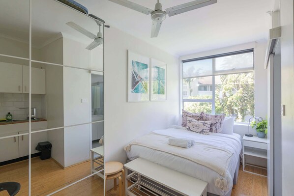 We have a super comfy Queen Bed available with a TV set up. It is a small but charming space perfectly suited for couples or solo travellers needed the ideal location for their Sydney stay.