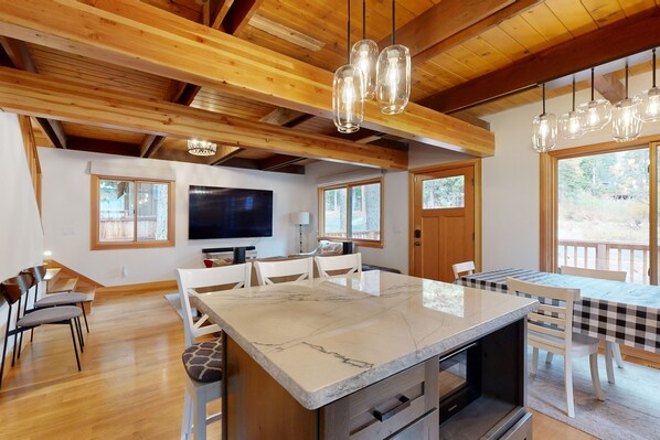 Step inside and discover a cozy living room equipped with an impressive 80-inch smart 4K TV, perfect for movie nights or catching up on your favorite shows. The three carefully curated bedrooms, containing king and queen beds, allow room for family and friends to spread out. The loft also features twin XL beds and arcade games, providing both extra sleeping spaces and hours of entertainment for guests of all ages and two private workspaces.