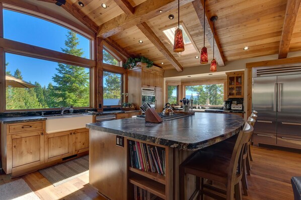 Experience unparalleled luxury at Wolf Ridge, a stunning mountain home fully remodeled to offer the finest vacation rental. No expense has been spared in furnishing and outfitting this spacious and elegantly appointed property, which boasts a bright and open floor plan that is perfect for entertaining and relaxation. The large kitchen is outfitted with top-of-the-line appliances, capturing beautiful tree-filtered lake views from the sink window. The living room features brand-name AV equipment, including a 48-inch LCD TV and high-quality stereo system, while the adjacent sitting room features a magnificent stone fireplace and comfortable seating for a quiet evening in. The dining area seats up to eight and leads out to the sunny deck, complete with a six-person hot tub, outdoor dining set, and BBQ. On the main floor, you'll find the luxurious primary suite, a spacious retreat featuring a king bed with high-quality linens, a gas fireplace, and a reading desk. The en-suite bathroom is a spa-like retreat, complete with an extra-deep soaking tub, double vanity sinks, and a double-headed shower. Downstairs, you'll find three additional bedrooms, each furnished and designed to exceed the mountain comfort. The second bedroom features a king bed and an en-suite bath, while bedrooms three and four each offer a queen bed and share a full bath. In the summer, enjoy the sun just minutes away from Lake Tahoe and Tahoe City, and in the winter, enjoy the convenience of the heated double garage and close proximity to great skiing, snowboarding, and other snow-filled fun activities. For luxury accommodations in a prime location, look no further than Wolf Ridge!