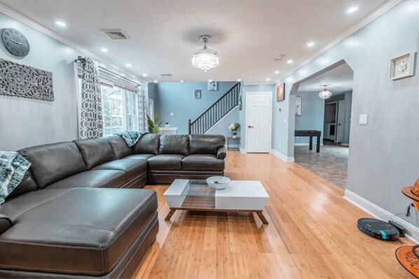 As you step into the house, you'll be struck by the warmth and coziness of the living room. Sink into the plush sofa and pop on the 75" TV. The house boasts Gigabit internet available throughout the house for all your online needs.