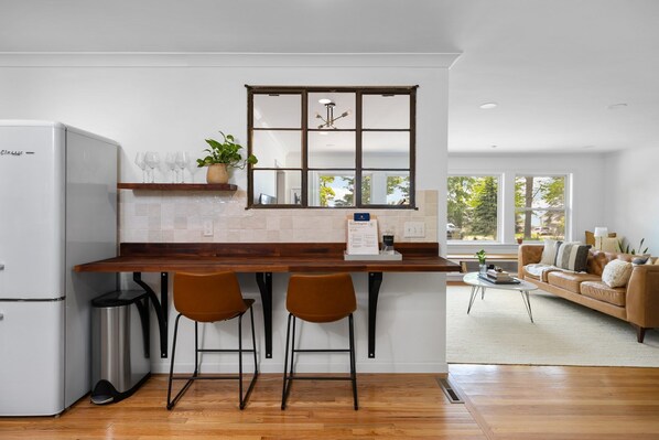 The house was lovely. One of the nicest we've stayed at in TC. Since I had hip surgery a few months ago, the ranch style of the house was what I needed to get around easily. There are 2 bedrooms, 2 bathrooms. Updated kitchen with an awesome gas stove. Cute retro (but modern) styled refrigerator, but its more an apartment size rather than full size. Ror 2 people it was just right. The home is close enough to drive easily into TC but far enough away to be peaceful. Property managers were just a text away and were VERY responsive.