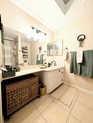 This single-story home has three bedrooms, two full bathrooms, and a layout that gives you both privacy and flexibility. The large primary bedroom has a king-size bed, a big closet, a dresser, and a private bathroom with a walk-in shower. There's also a bonus space attached to the primary, great for a work-from-home setup or just a quiet corner to yourself. The two other bedrooms each have queen-size beds, dressers and closets, and one includes a mounted TV.