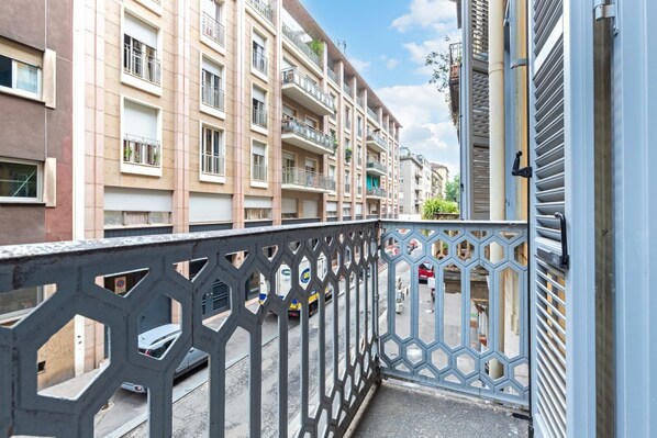 The two bedrooms are located on a mezzanine, creating an intimate and original atmosphere. Each room has two beds, offering a total of six sleeping places, ideal for families, groups of friends, or anyone sharing the apartment. A private balcony allows you to enjoy the outdoors and admire the lively atmosphere of the neighborhood, making the environment even more welcoming and bright.