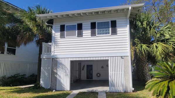 Inside, the cottage exudes warmth and style, featuring a king-size bed, Smart TV, and cozy bar-style dining. The well-equipped kitchenette makes it easy to prepare light meals, while the screened balcony and under-house porch swing invite you to unwind in the salty breeze. Added comforts include Wi-Fi, a washer and dryer, and thoughtful design details throughout.