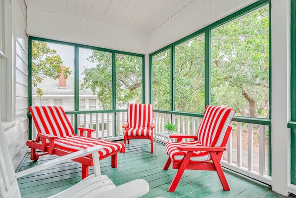 Outside, enjoy the convenience of a gas grill and an outdoor shower, perfect for rinsing off sandy feet after a day at the beach. The highlight of the cottage is undoubtedly the spacious screened-in front porch. Complete with deck chairs, loungers, and two picnic tables accommodating up to eight people, it's the idyllic spot for games, snacks, and memorable crab dinners and low country boils.