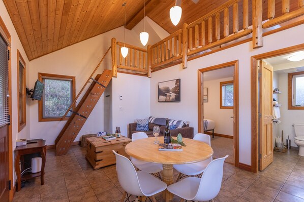This was a quiet cabin with easy reach of amenities. The folks managing the cabin were responsive and helpful. The loft is a bit tricky (low ceilings and a ladder to get up), but the kids reported how comfortable the beds were.