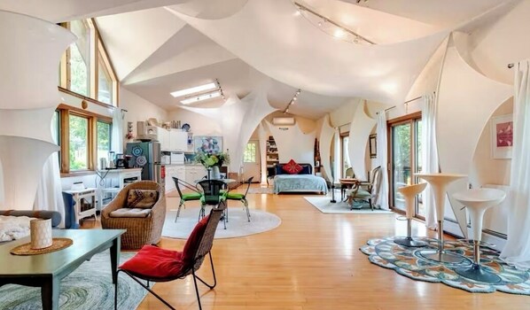 Escape to the artist dream loft, a haven for creatives and those seeking serenity. This light-filled space overlooks a picturesque pond with a waterfall and features high ceilings, wood floors, and fabric sculptures. Enjoy yoga or meditation on the wraparound deck with lounge chairs or by the fire pit near the pond's edge.