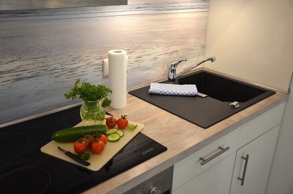Kitchen and household: Fitted kitchen, fridge with freezer compartment, 4-zone ceramic hob, oven, extractor hood, dishwasher, coffee machine, toaster, kettle, high-quality dishes and cutlery