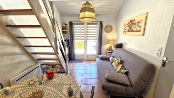 On the ground floor, enjoy a comfortable sleeping area with a bedroom featuring a double bed (140 cm) and optimized storage, complemented by a bathroom with an electric towel warmer and a separate WC.