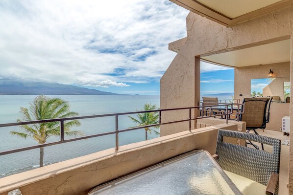 There is a brand new split A/C in the living room and guest bedroom (covering the front and back of the condo), ceiling fans, and wonderful ocean breezes. The fully equipped kitchen is perfect for making meals where you can enjoy ocean views while you prep! Panoramic ocean views with dramatic Haleakala in the distance! This top floor, end unit is sure to impress. Five miles of perfect sandy beach where turtles love to play await below. During the winter months, sit front row on our expansive lanai as many whales breach in view. Walk to shops, restaurants, and attractions from this resort. In the evening, enjoy beautiful sunsets and the twinkling lights of Kihei and Wailea in the distance. Island Sands Resort is located in central Maui, making it easy to explore all other corners of Maui. This condo comes equipped with a TV and complimentary WiFi.