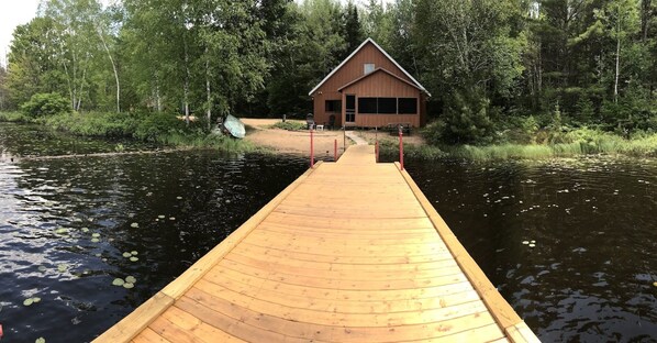 Please note: the area near the dock is soft, shallow, and marshy, so it is not ideal for swimming directly off the dock. There are sandy swimming spots around the lake.