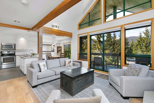 Step from the living room onto the private deck, where fresh alpine air and quiet treetop views create a peaceful winter backdrop. Outdoor furniture and a BBQ grill give you space to unwind even during colder months, while the private hot tub provides a soothing end to active days on the mountain.