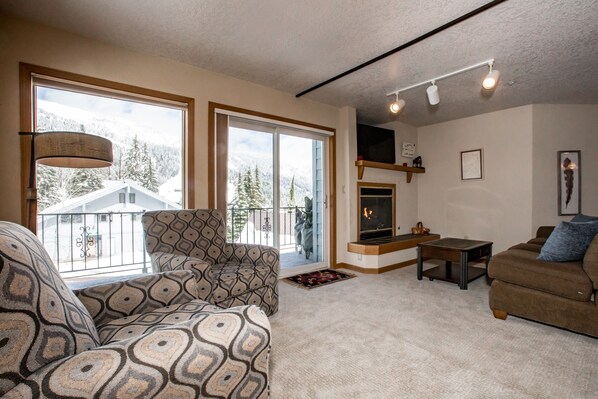 Bitterroot 2 is a great base lodge for your ski or summer Whitefish adventures. The views of Big Mountain from the living room and deck are incredible. The unit is clean and well-maintained, with the ability to sleep 5 comfortably. Cozy up by the fireplace during the winter and enjoy the views from the deck after a long day in Glacier National Park or on the slopes for Après skiing. The building has fantastic ski access just up the road, and you can easily ski back to the building. The ski locker room on the main floor will house all of your ski gear. There is an indoor shared hot tub, open only in the winter. Wifi, cable television, Mr. Coffee-style coffee maker and a dutch oven are included. The main bedroom has a comfortable queen bed and a twin bedroom just around the corner. There is a queen murphy bed in the living room with a divider that makes the space private from the living room and kitchen. You have great views from the sleeping space. **Two portable Air conditioning units were added to the condo. One for the bedroom and one for the living room **