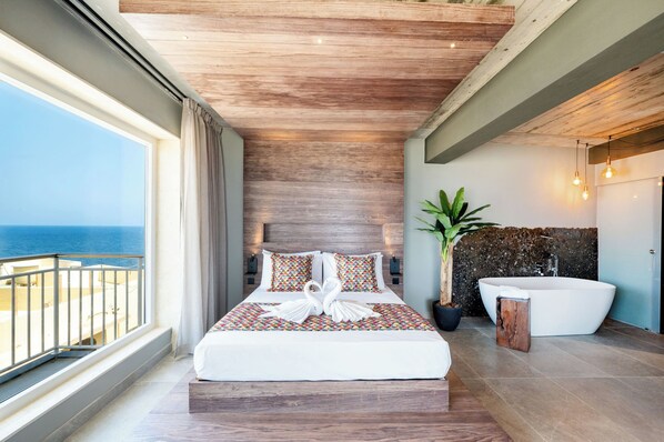 Indulge in the opulence of a spacious living area, with the option of opening a sofa bed for an additional child or adult (maximum 3 guests in total). Some of our studio apartments even offer an open space bathtub in close proximity to the king-size bed.